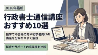 行政書士 行政書士通信講座おすすめ10選|独学で不合格の方や初学者向けの講座 行政書士試験は合格率10%前後の難関資格であり、独学での対策に限界を感じる方も少なくありません。試験範囲が非常に広いため、効率よく、要点を絞ってポイントを押さえることが重要です。また、配点の大きい科目や記述式問題への対策も欠かせません。多く... 2026.04.15 行政書士